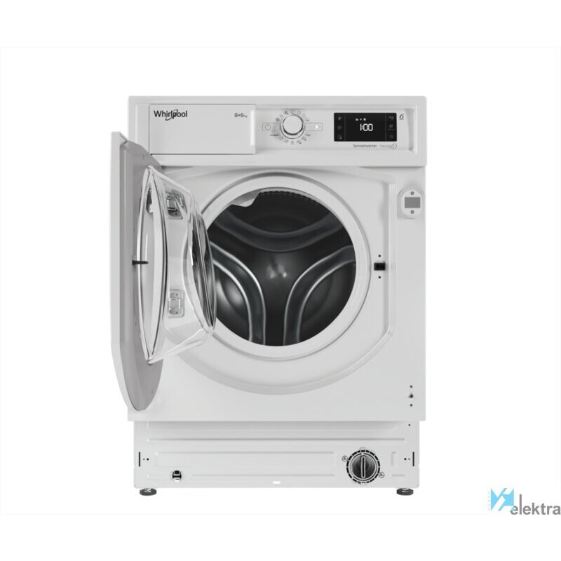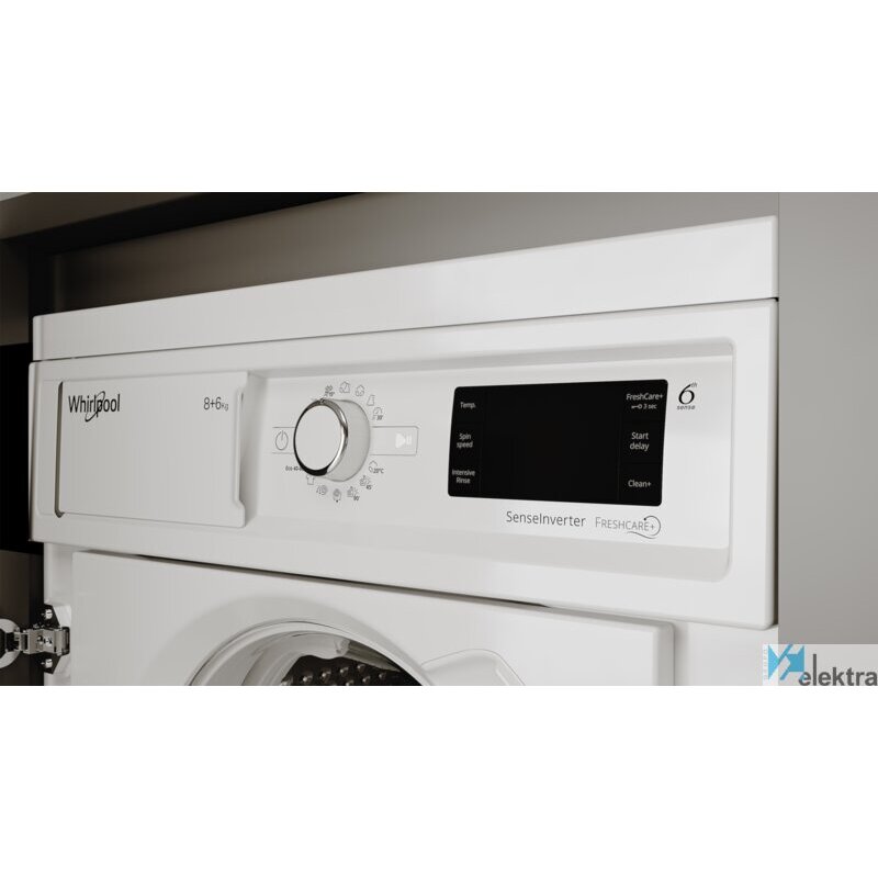 Whirlpool FreshCare BI WDWG 861485 EU. Tipo de carga: Carga frontal, Tipo de instalación: Integrado, Color del producto: Blanco. Capacidad de nominal (lavado y secado): 6 kg, Máxima velocidad de centrifugado: 1400 RPM, Clase de secado por giro: B. Longitud del cable: 1,2 m. Clase de eficiencia energética (lavado): B, Clase de eficiencia energética (lavado y secado): D, consumo de agua de lavado: 48 L. Profundidad: 545 mm, Ancho: 595 mm, Altura: 815 mm