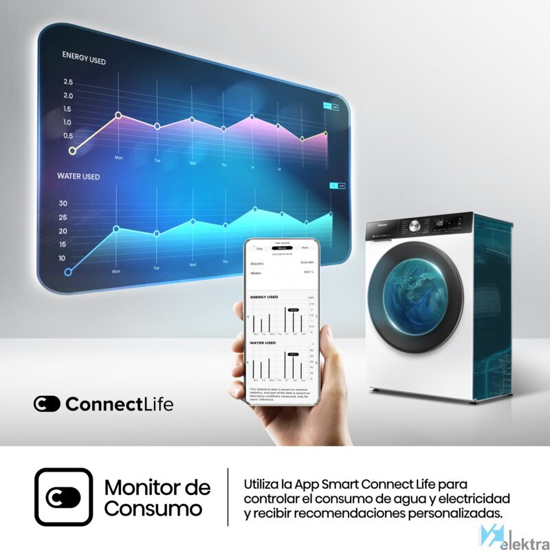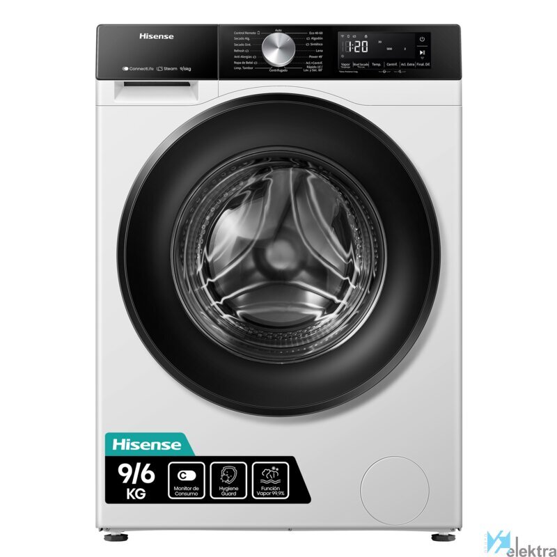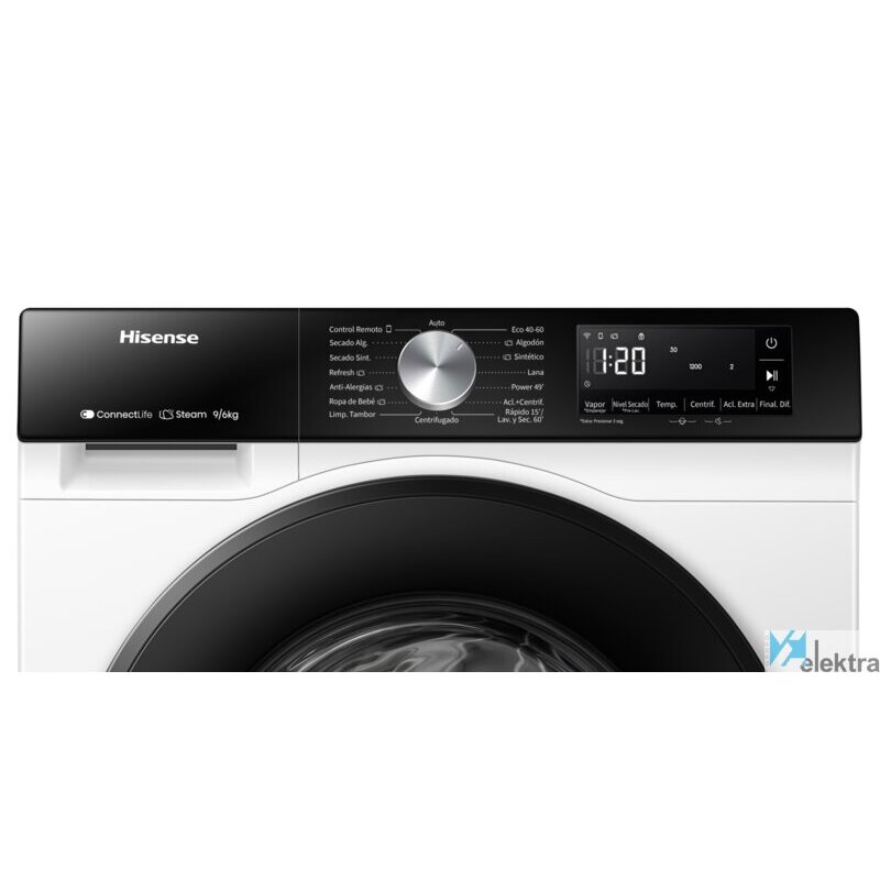 | Tecnologías Hisense (cuidado de la ropa) | Allergy Care, Big LED Display, Bloqueo infantil, Aplicación ConnectLife, Limpieza del tambor, Durable Inverter, Favourite, Half load, Hygiene Guard, Motor Inverter, Jet Wash, Pause & Add, PureJet, Lavado rápido, Quick Wash (15min), Smart Link, Vapor, Wash&Dry 60' |