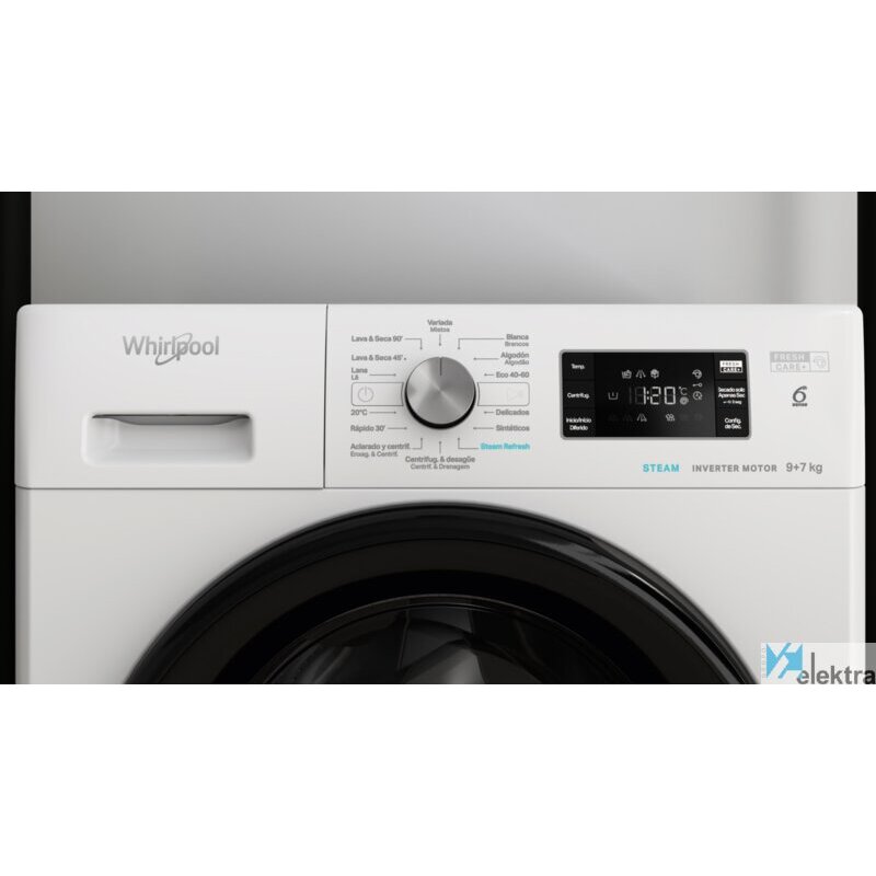 Whirlpool FFWDB 976258 BV SPT. Tipo de carga: Carga frontal, Tipo de instalación: Independiente, Color del producto: Blanco. Capacidad de nominal (lavado y secado): 7 kg, Máxima velocidad de centrifugado: 1551 RPM, Clase de secado por giro: A. Longitud del cable: 1,2 m. Clase de eficiencia energética (lavado): B, Clase de eficiencia energética (lavado y secado): E, consumo de agua de lavado: 5 ...Recipiente :