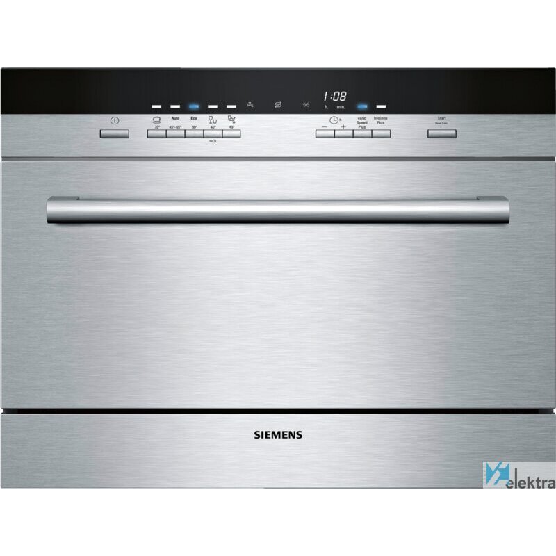 Siemens SK75M521EU. Tipo de instalación: Semi integrado, Talla del producto: Compacto, Color de la puerta: Acero inoxidable. Número de cubiertos: 6 cubiertos, Nivel de ruido: 47 dB, Programas de lavado: Auto, Vidrio/Delicado, Intensivo, Rápido. Consumo de agua por ciclo de lavado: 8 L, Clase de eficiencia energética (antigua): A+, Consumo de energía por ciclo: 0,61 kWh. Ancho: 595 mm, Altura: 454 mm, Peso: 22 kg. Clase de secado: A, Clase de lavado: A