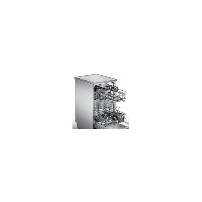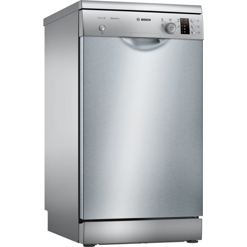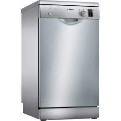 Bosch SPS25CI05E. Tipo de instalación: Independiente, Talla del producto: Estrecho (45 cm), Color de la puerta: Acero inoxidable. Número de cubiertos: 9 cubiertos, Clase de emisión de ruido: C, Nivel de ruido: 48 dB. Color de luz de fondo: Rojo. Clase de eficiencia de energía: F, Consumo de agua por ciclo de lavado: 8,5 L, Consumo de energía por 100 ciclos: 78 kWh. Ancho: 450 mm, Profundidad: 600 mm, Altura: 845 mm