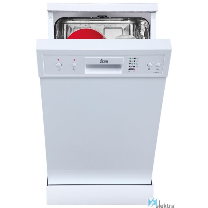 Teka LP8 400. Tipo de instalación: Independiente, Talla del producto: Estrecho (45 cm), Color de la puerta: Blanco. Número de cubiertos: 9 cubiertos, Nivel de ruido: 49 dB, Programas de lavado: Eco, Rápido. Consumo de energía por ciclo: 0,75 kWh, Carga conectada: 2100 W, Consumo de energía (apagado): 0,45 W. Ancho: 448 mm, Profundidad: 600 mm, Altura: 845 mm. Clase de secado: A, Consumo de energía anual: 215 kWh, Consumo anual de agua: 2660 L