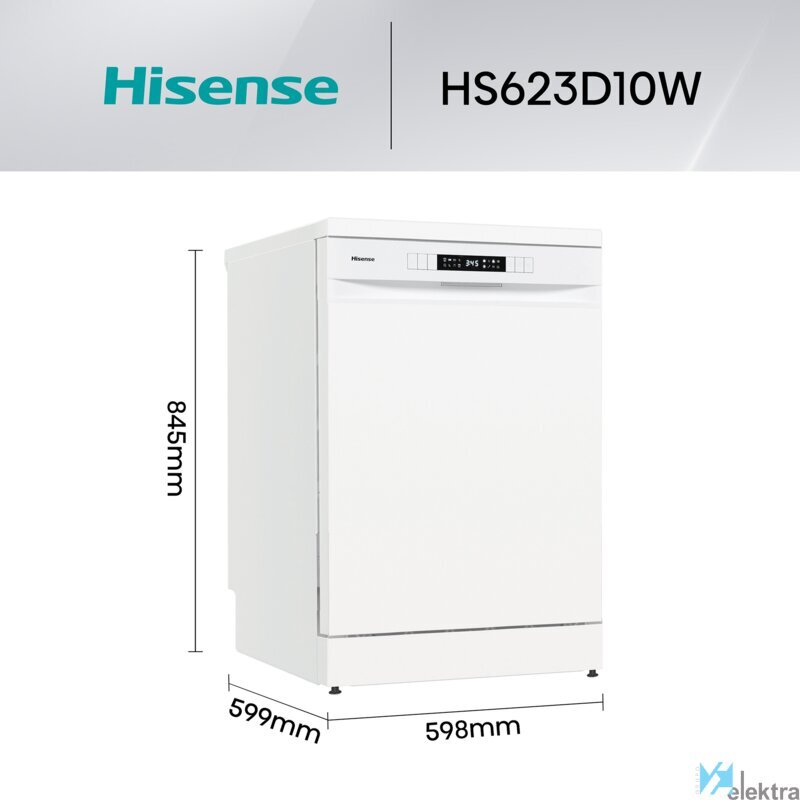 Hisense HS623D10W. Tipo de instalación: Independiente, Talla del producto: Tamaño completo (60 cm), Color de la puerta: Blanco. Número de cubiertos: 14 cubiertos, Clase de emisión de ruido: B, Nivel de ruido: 47 dB. Clase de eficiencia de energía: D, Consumo de agua por ciclo de lavado: 11 L, Consumo de energía por 100 ciclos: 85 kWh. Ancho: 598 mm, Profundidad: 600 mm, Altura: 845 mm. Ancho d ...Recipiente :