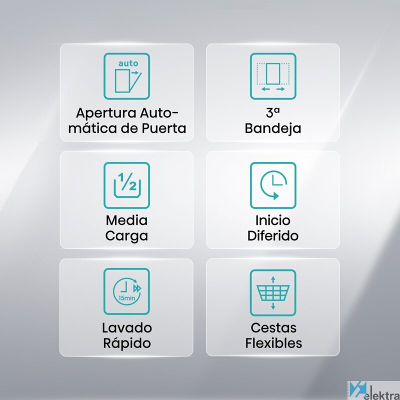 | Características principales | Auto secado extra; control táctil; 3 cestas; incicador de ayuda aclarado; 7 niveles de temperatura; ablandador de agua; Sistema de seguridad: Partial Aquastop. |