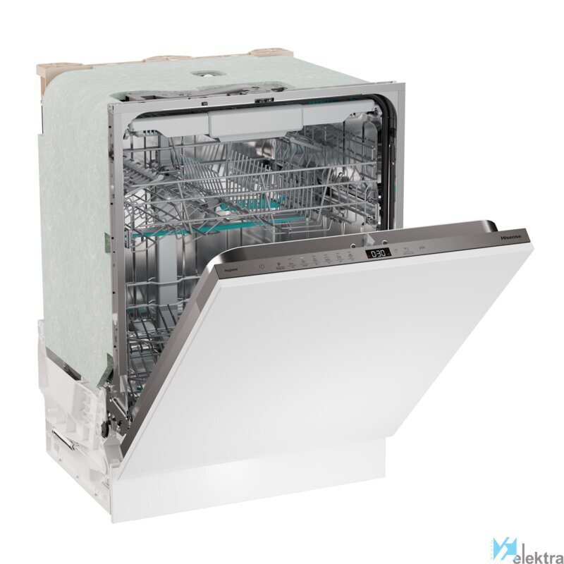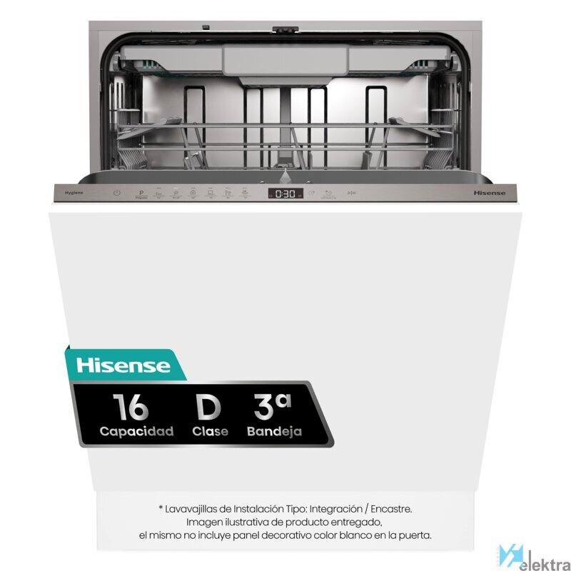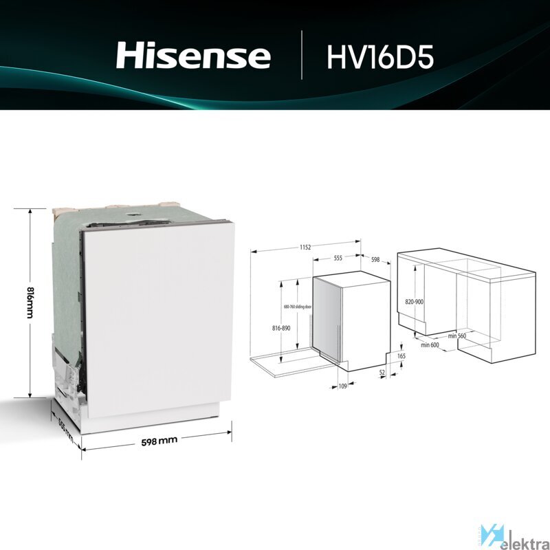 Hisense HV16D5. Tipo de instalación: Completamente integrado, Talla del producto: Tamaño completo (60 cm), Color de la puerta: Blanco. Número de cubiertos: 16 cubiertos, Clase de emisión de ruido: B, Nivel de ruido: 44 dB. Clase de eficiencia de energía: D, Consumo de agua por ciclo de lavado: 10,9 L, Consumo de energía por 100 ciclos: 85 kWh. Ancho: 598 mm, Profundidad: 555 mm, Altura: 816 mm ...Recipiente :