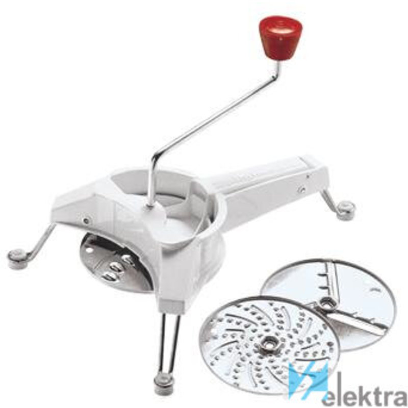 Moulinex K10110. Color del producto: Acero inoxidable, Blanco, Material: Plástico, Acero inoxidable, Mejores usos: Queso, Chocolate, Verduras. diámetro del disco: 12 cm, Peso: 456 g. Ancho del paquete: 188 mm, Profundidad del paquete: 267 mm, Altura del paquete: 82 mm. País de origen: Francia