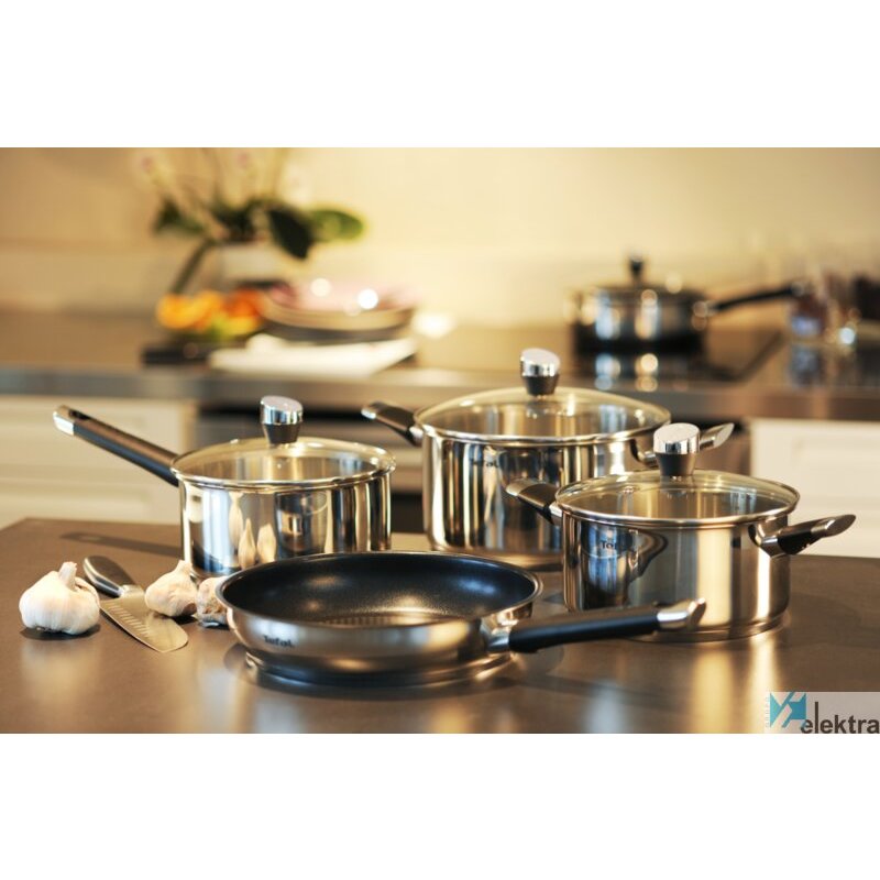 Tefal Emotion E82404. Forma: Alrededor, Tipo: Sartén multiuso, Color del producto: Acero inoxidable. Diámetro: 24 cm, Peso: 970 g. Ancho del paquete: 256 mm, Profundidad del paquete: 442 mm, Altura del paquete: 96 mm. No contiene: Ácido perfluorooctanoico (PFOA). Cantidad por contenedor (20ft): 4056 pieza(s), Cantidad por contenedor (40ft): 8322 pieza(s), Cantidad por contenedor intermodal (40ft, HC): 9744 pieza(s)