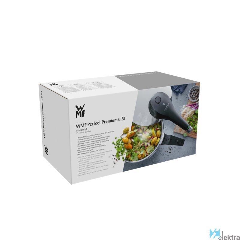WMF Perfect Premium 0795839990. capacidad total: 6,5 L, Adecuado para los tipos de cubiertas: Cerámico, Gas, Halógeno, Inducción, Color del producto: Acero inoxidable. Altura: 185 mm. Dimensiones del embalaje (alto x alto x peso): 260 x 480 x 250 mm, Peso del paquete: 4,46 kg