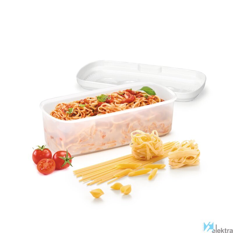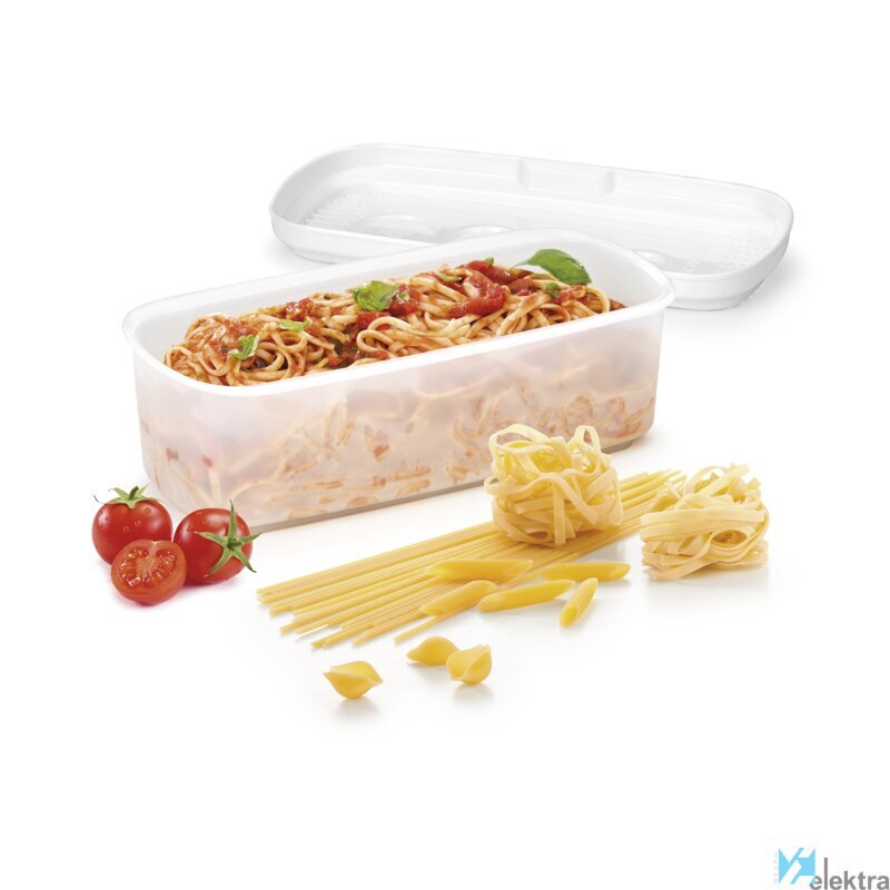 | Texto Descriptivo Canal OnLine | Excelente para preparar de forma fácil y rápida espaguetis y otras pastas en el microondas sin el riesgo de que se pase o desborde el vapor. La pasta puede escurrirse directamente en el recipiente una vez cocinada. Fabricado utilizando la tecnología única nanoCARE de plástico superior apto para uso médico y farmacéutico. |