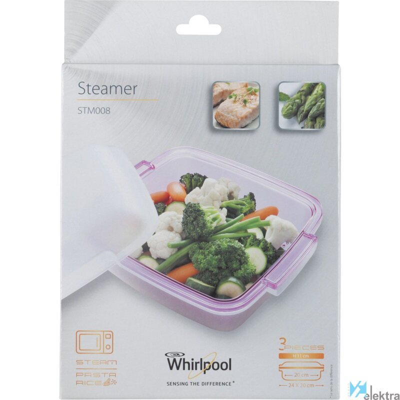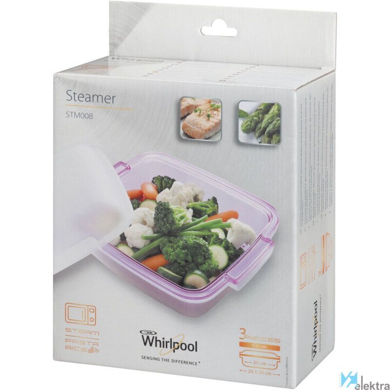 Whirlpool STM008. Tipo de producto: Vaporizador, Color del producto: Púrpura, Blanco, Material de la carcasa: Plástico. Ancho: 240 mm, Profundidad: 200 mm, Altura: 110 mm. Cantidad por paquete: 1 pieza(s)Recipiente :