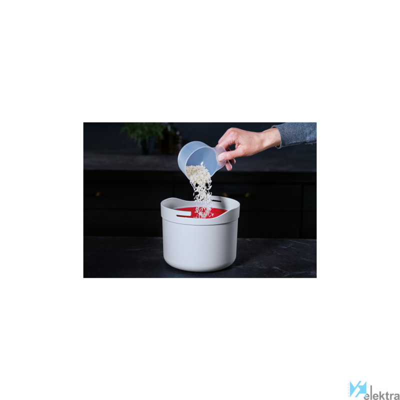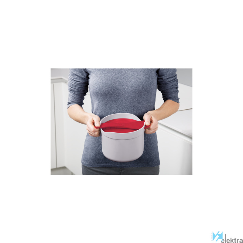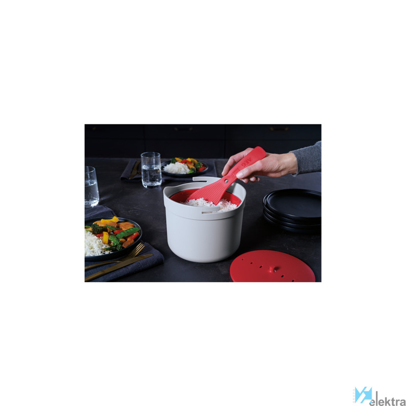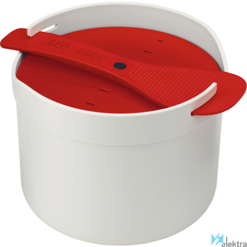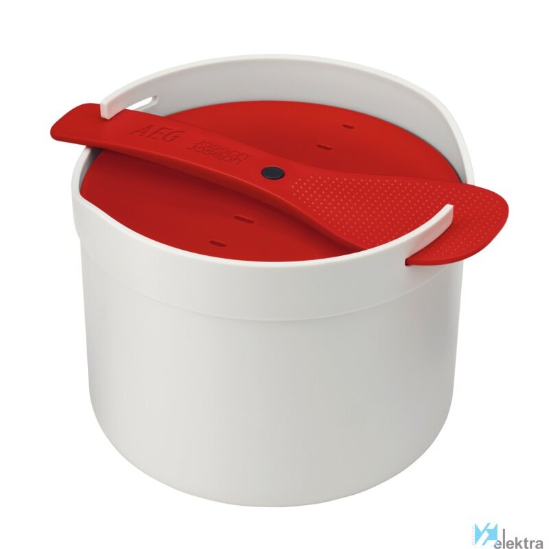 Recipiente para cocer grano y arroz diseño de Joseph Joseph para AEG. El juego consta de una cazuela grande de 2 litros con tapa, escurridor, taza dosificadora y paleta multiusos. La paletaRecipiente :