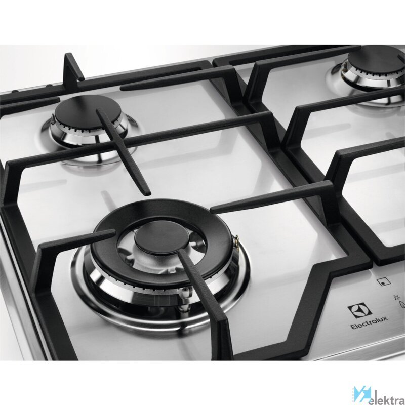Electrolux KGS6436X. Color del producto: Acero inoxidable, Tipo de instalación: Integrado, Anchura de los quemadores: 60 cm. Tipo de control: Giratorio, Control de posición: Parte superior delantera. Voltaje de entrada AC: 220-240 V, Frecuencia de entrada AC: 50 - 60 Hz. Ancho: 595 mm, Profundidad: 510 mm, Altura: 40 mm