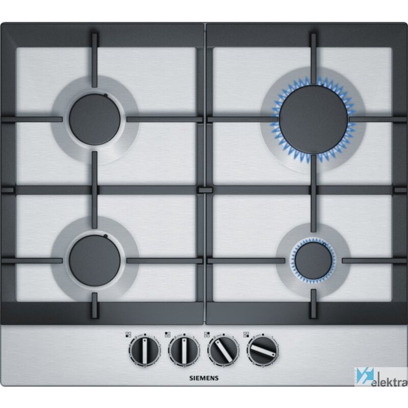 Siemens EC6A5PB90. Color del producto: Negro, Acero inoxidable, Tipo de instalación: Integrado, Tipo de quemador: Encimera de gas. Zona de cocción a fuego lento: 1000 W, Zona de cocción media: 1750 W, Zona de cocción grande: 3000 W. Tipo de control: Giratorio, Control de posición: Parte superior delantera. Carga conectada (eléctrica): 1 W, Carga conectada (gas): 7500 W, Voltaje de entrada AC: 220-240 V. Ancho: 582 mm, Profundidad: 520 mm, Altura: 45 mm