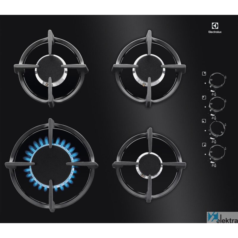 Electrolux KGG6407K. Color del producto: Negro, Tipo de instalación: Integrado, Anchura de los quemadores: 60 cm. Tipo de control: Giratorio, Control de posición: Arriba a la derecha. Voltaje de entrada AC: 220-240 V, Frecuencia de entrada AC: 50-60 Hz. Ancho: 590 mm, Profundidad: 510 mm, Altura: 45 mm