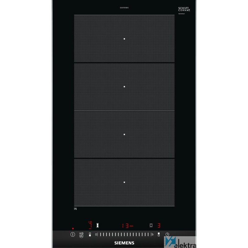 Siemens EX375FXB1E. Color del producto: Negro, Tipo de instalación: Integrado, Tipo de quemador: Con placa de inducción. Zona de cocción a fuego lento: 3700 W, Zona de cocción media: 3700 W. Tipo de control: Tocar, Control de posición: Parte superior delantera, Tipo de visualizador: LED. Carga conectada (eléctrica): 3700 W, Voltaje de entrada AC: 220-240 V, Frecuencia de entrada AC: 50 - 60 Hz. Ancho: 302 mm, Profundidad: 520 mm, Altura: 51 mm