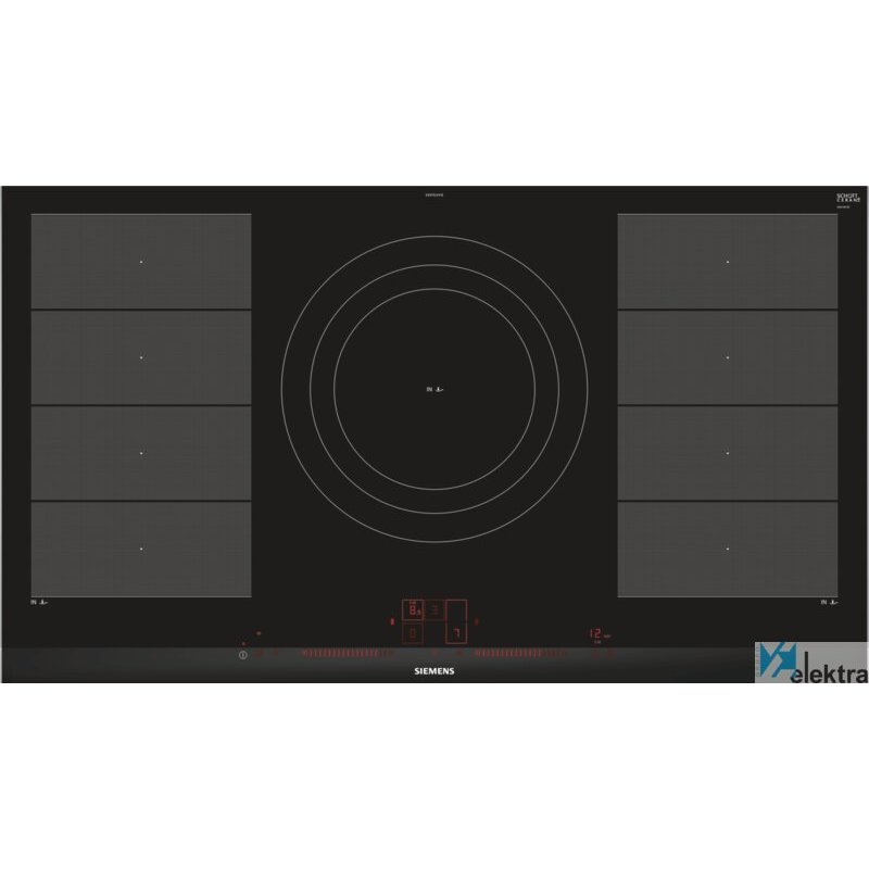 Siemens EX975LVV1E. Color del producto: Negro, Tipo de instalación: Integrado, Tipo de quemador: Con placa de inducción. Zona de cocción a fuego lento: 2200 W, Zona de cocción media: 3300 W, Certificación: AENOR, CE. Tipo de control: Tocar, Control de posición: Parte superior delantera. Carga conectada (eléctrica): 11100 W, Voltaje de entrada AC: 220-240 V, Frecuencia de entrada AC: 50 - 60 Hz. Ancho: 912 mm, Profundidad: 520 mm, Altura: 51 mm