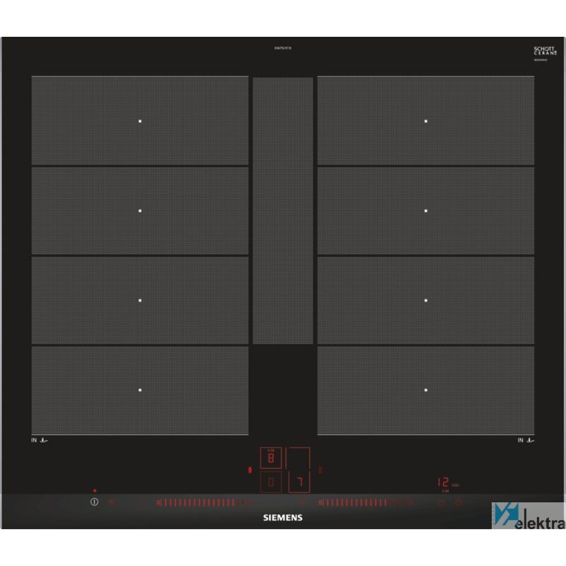 Siemens EX675LYC1E. Color del producto: Negro, Acero inoxidable, Tipo de instalación: Integrado, Tipo de quemador: Con placa de inducción. Zona de cocción a fuego lento: 2200 W, Zona de cocción media: 3300 W. Tipo de control: Barra de desplazamiento, Tocar, Control de posición: Parte superior delantera. Carga conectada (eléctrica): 7400 W, Voltaje de entrada AC: 220-240 V, Frecuencia de entrada AC: 50 - 60 Hz. Ancho: 602 mm, Profundidad: 520 mm, Altura: 51 mm