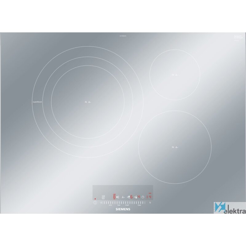 Siemens EH779FDC1E. Color del producto: Acero inoxidable, Tipo de instalación: Integrado, Tipo de quemador: Con placa de inducción. Zona de cocción a fuego lento: 1400 W, Zona de cocción media: 2200 W, Zona de cocción de alta potencia extra grande: 3300 W. Tipo de control: Tocar, Control de posición: Parte superior delantera. Carga conectada (eléctrica): 7400 W, Frecuencia de entrada AC: 50 - 60 Hz. Ancho: 710 mm, Profundidad: 520 mm, Altura: 51 mm