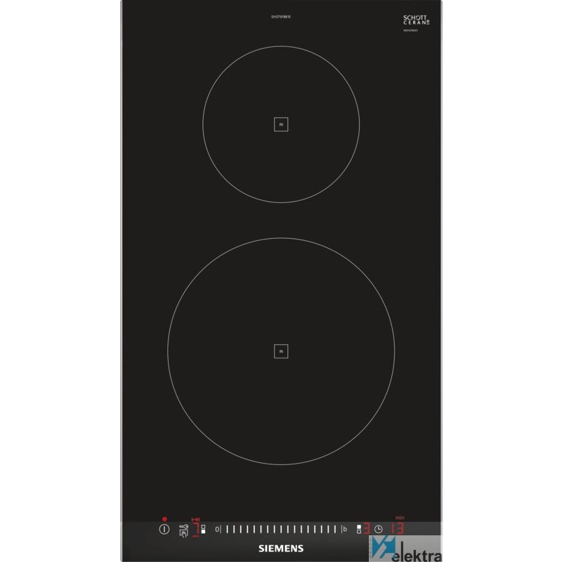 Siemens EH375FBB1E. Color del producto: Negro, Tipo de instalación: Integrado, Tipo de quemador: Con placa de inducción. Zona de cocción a fuego lento: 1400 W, Zona de cocción media: 2200 W. Tipo de control: Tocar, Control de posición: Parte superior delantera. Carga conectada (eléctrica): 3700 W, Voltaje de entrada AC: 220-240 V. Longitud del cable: 1,1 m, Ancho de compartimiento de instalación: 27 cm, Profundidad del compartimiento de instalación: 49 cm