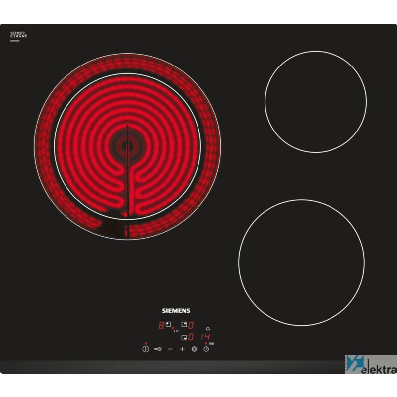 Siemens ET631BK17E. Color del producto: Negro, Tipo de instalación: Integrado, Tipo de quemador: Cerámico. Zona de cocción a fuego lento: 1200 W, Zona de cocción media: 2000 W, Zona de cocción grande: 2700 W. Tipo de control: Tocar, Control de posición: Parte superior delantera. Carga conectada (eléctrica): 5700 W, Voltaje de entrada AC: 220 - 240 V, Frecuencia de entrada AC: 50 - 60 Hz. Ancho: 592 mm, Profundidad: 522 mm, Altura: 45 mm