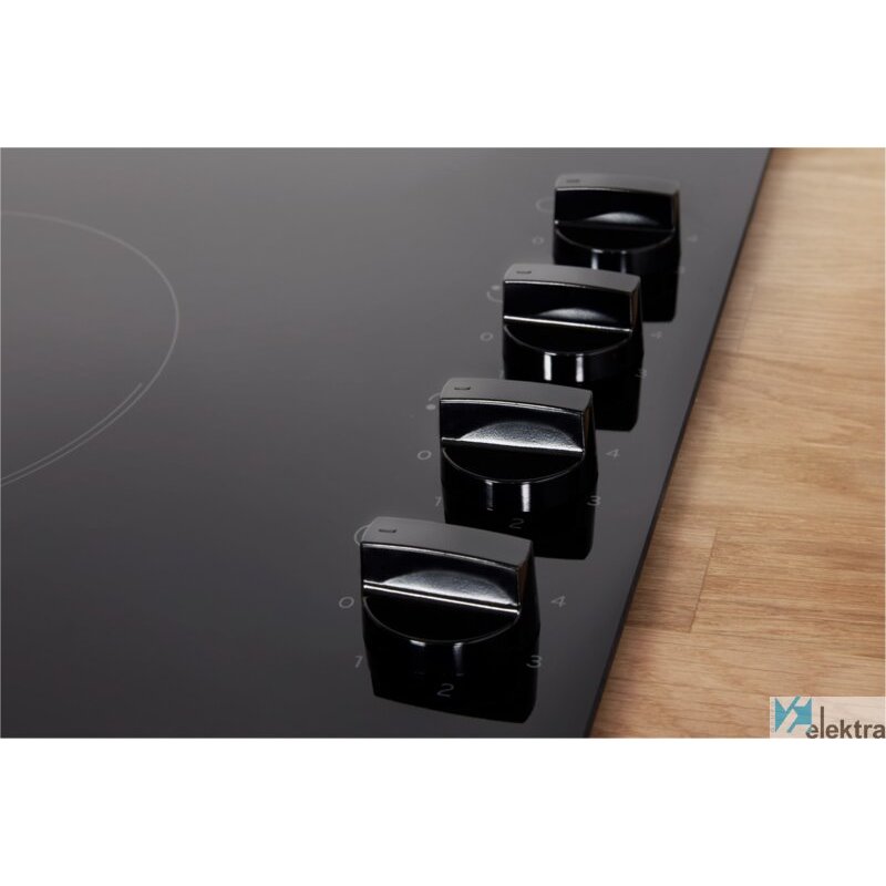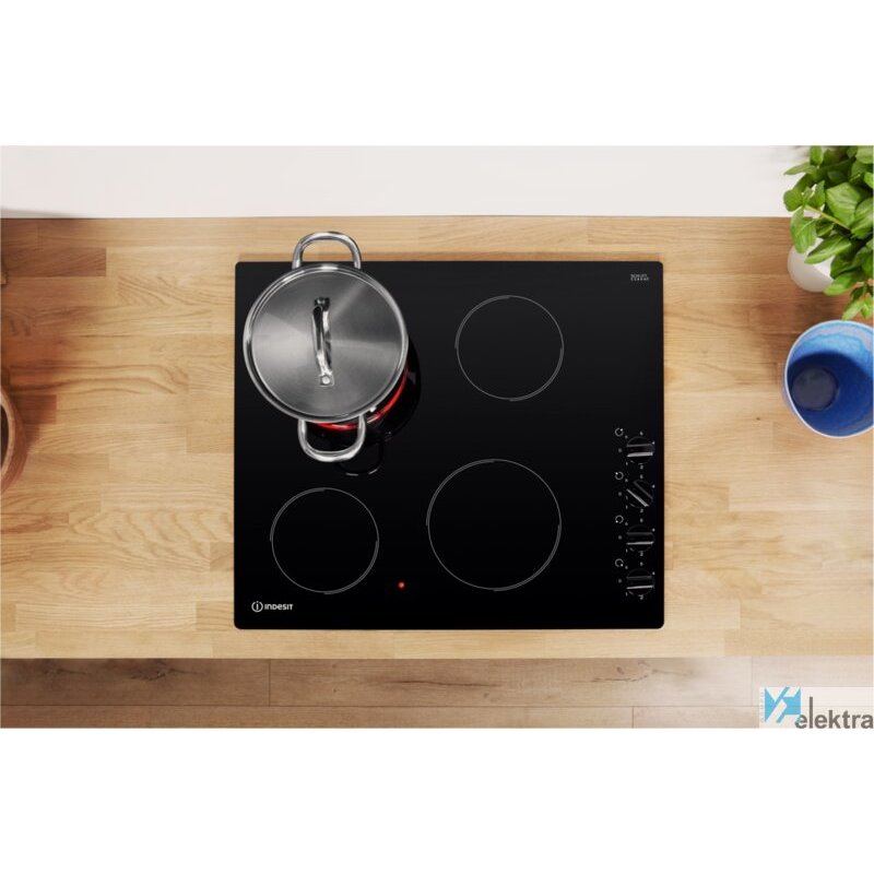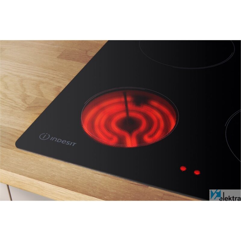 Indesit RI 860 C. Color del producto: Negro, Tipo de instalación: Integrado, Tipo de quemador: Cerámico. Certificación: CE. Tipo de control: Giratorio, Control de posición: Parte delantera derecha, Tipo de encendido electrónico: Encendido con perilla. Carga conectada (eléctrica): 5800 W, Voltaje de entrada AC: 220 - 230 V, Frecuencia de entrada AC: 50 - 60 Hz. Tecnologías Indesit (cocción): Easy Clean