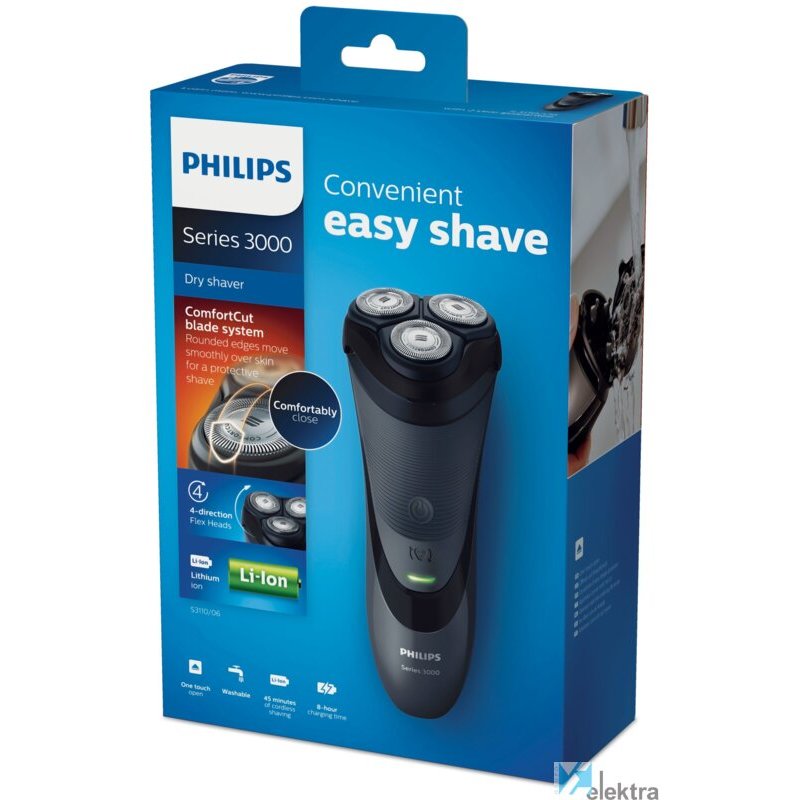 Philips SHAVER Series 3000 Afeitadora eléctrica en seco S3110/06. Sistema de afeitado: Máquina de afeitar de rotación, Color del producto: Negro, Tecnologías de sistema de afeitado: ComfortCut Blade System. Fuente de energía: AC/Batería, Tecnología de batería: Ión de litio, Tiempo de funcionamiento: 45 min. Ancho del paquete: 159 mm, Profundidad del paquete: 70 mm, Altura del paquete: 232 mm. Cantidad por paquete: 1 pieza(s). Característica(s) de mango: Ergonómico, País de origen: Países Bajos