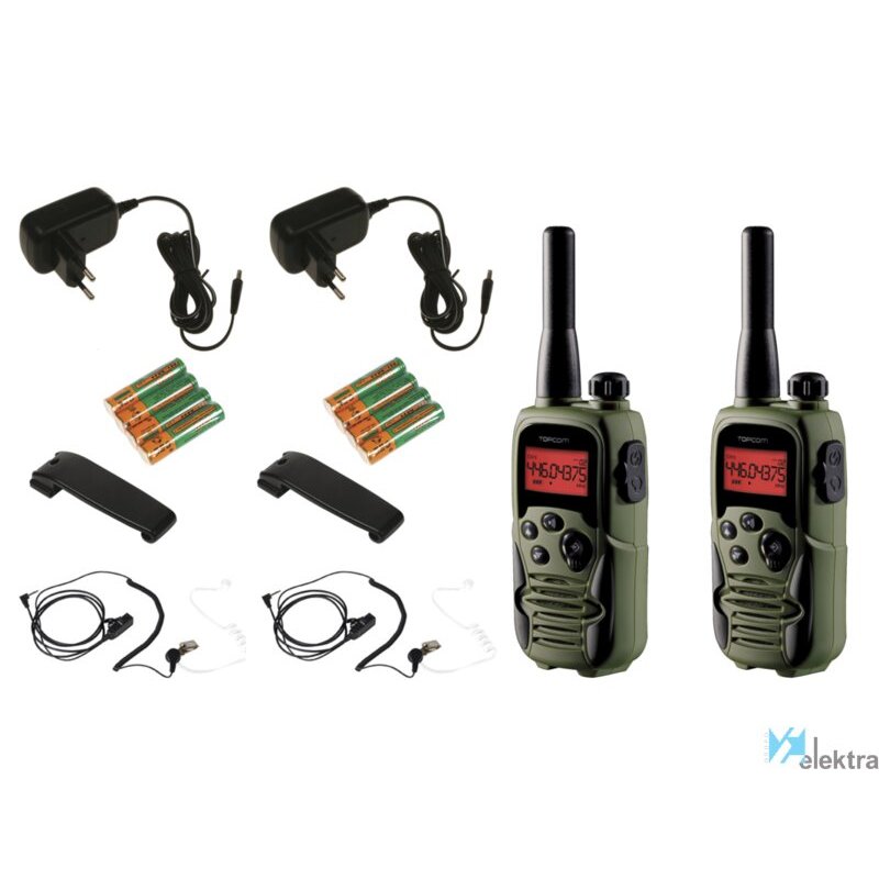 Topcom RC-6406 Walkie-Talkie - Twintalker 9500 Airsoft Edition. Número de canales (total): 8 canales, Frecuencia de operación: 446 MHz, Alcance máximo: 10000 m. Tipo de visualizador: LCD. Tipo de batería: AAA, Tecnología de batería: Níquel-metal hidruro (NiMH), Autonomía: 10 h. Peso: 500 g, Ancho del paquete: 125 mm, Profundidad del paquete: 147 mmRecipiente :