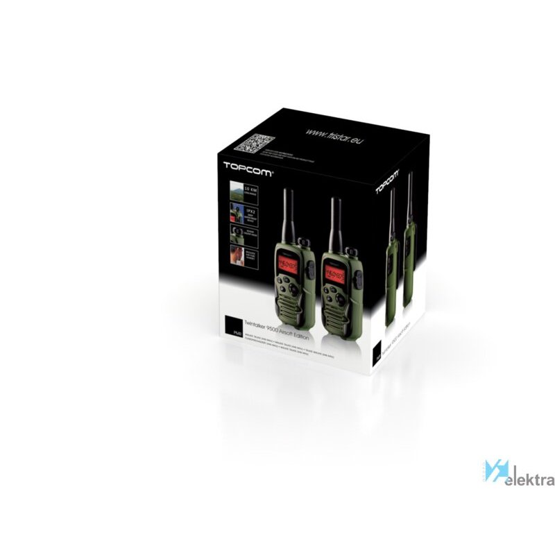 Topcom RC-6406 Walkie-Talkie - Twintalker 9500 Airsoft Edition. Número de canales (total): 8 canales, Frecuencia de operación: 446 MHz, Alcance máximo: 10000 m. Tipo de visualizador: LCD. Tipo de batería: AAA, Tecnología de batería: Níquel-metal hidruro (NiMH), Autonomía: 10 h. Peso: 500 g, Ancho del paquete: 125 mm, Profundidad del paquete: 147 mm