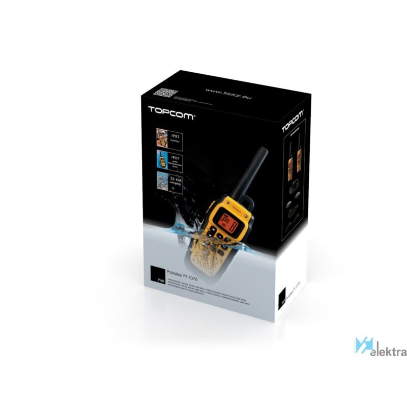 Topcom RC-6420 Walkie-Talkie - Protalker PT-1078. Número de canales (total): 8 canales, Frecuencia de operación: 446 MHz, Alcance máximo: 10000 m. Tipo de visualizador: LCD. Tipo de batería: AAA, Tecnología de batería: Níquel-metal hidruro (NiMH), Autonomía: 16 h. Peso: 650 g, Ancho del paquete: 175 mm, Profundidad del paquete: 248 mm