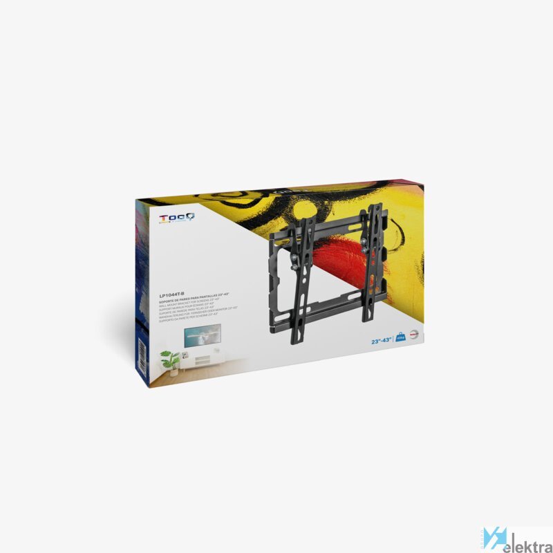 TooQ LP1044T-B. Capacidad máxima de peso: 45 kg, Tamaño mínimo de pantalla: 58,4 cm (23"), Tamaño máximo de pantalla: 109,2 cm (43"), Compatibilidad con interfaz de montaje (min): 50 x 50 mm, Compatibilidad con interfaz de montaje (max): 200 x 200 mm. Ángulo de inclinación: -8 - 0°, Distancia a la pared (min): 2 cm. Color del producto: NegroRecipiente :