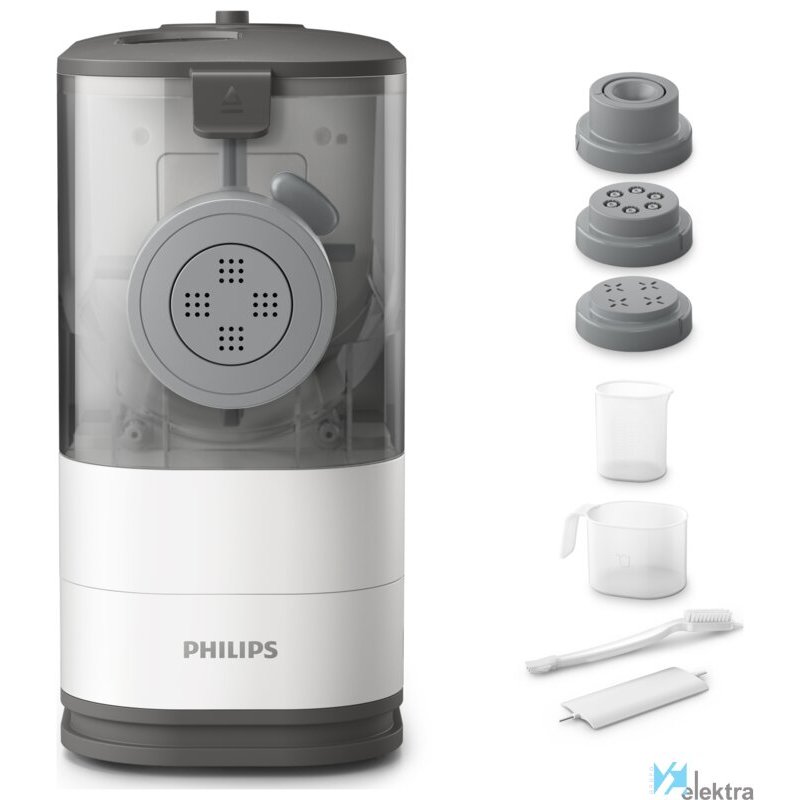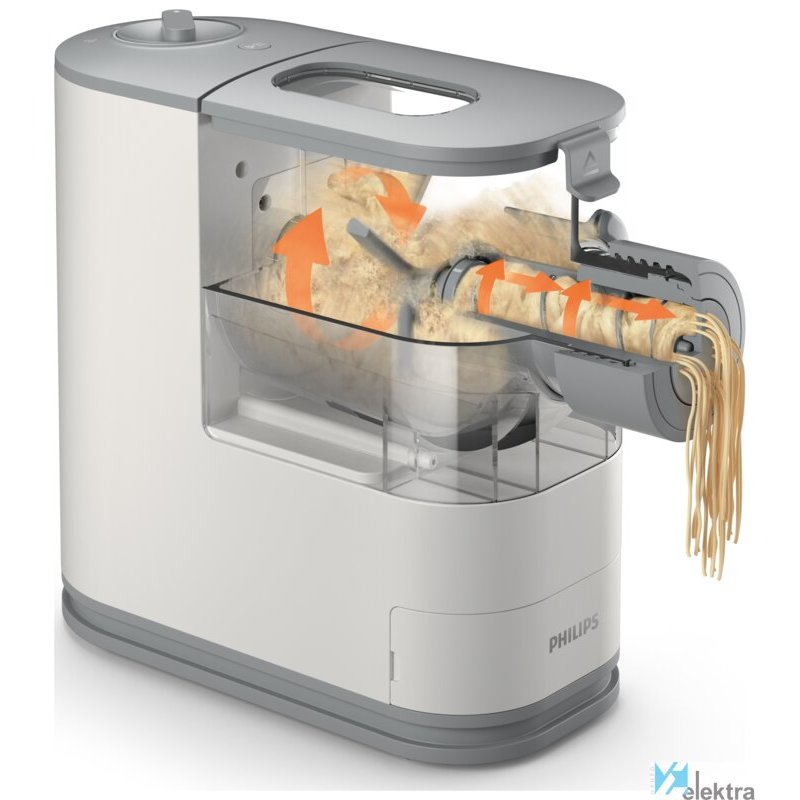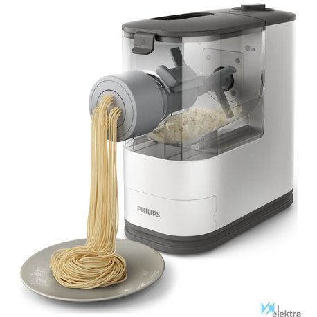 Philips Viva Collection HR2333/12 Máquina de hacer pasta y fideos. Tipo: Máquina eléctrica para elaborar pasta fresca, Mejores usos: Fettuccine, Lasaña, Penne (pasta), Espaguetis, Material: Plástico. Potencia: 150 W, Voltaje de entrada AC: 220 - 240 V, Frecuencia de entrada AC: 50 Hz. Ancho: 135 mm, Profundidad: 350 mm, Altura: 287 mm. Ancho del paquete: 230 mm, Profundidad del paquete: 400 mm ...Recipiente :