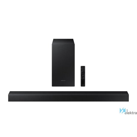 Samsung HW-T420. Canales de salida de audio: 2.1 canales, Potencia estimada RMS: 150 W, Decodificadores incorporados: Dolby Digital. Tipo de subwoofer: Altavoz de subgraves (subwoofer) pasivo, Ubicación del altavoz de graves: Separar. Color del producto: Negro, Formatos de audio soportados: AAC, AIFF, MP3, OGG, WAV. Tecnología de conectividad: Inalámbrico y alámbrico. Consumo eléctrico de la barra de sonido: 30 W, Consumo de energía (inactivo): 0,5 W