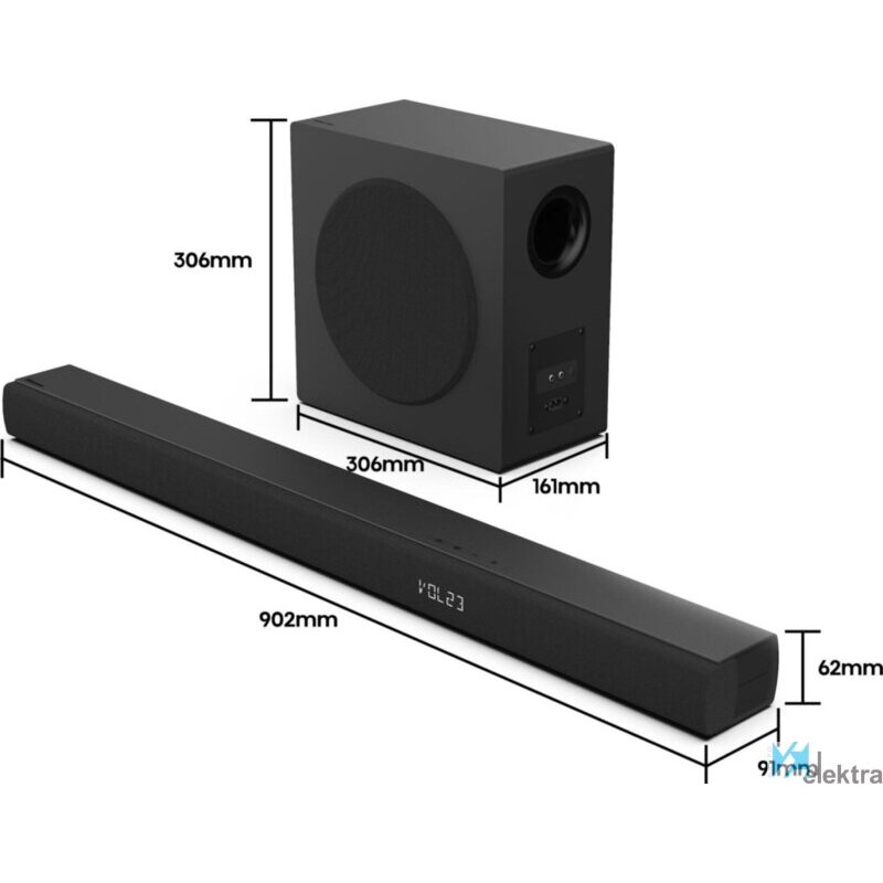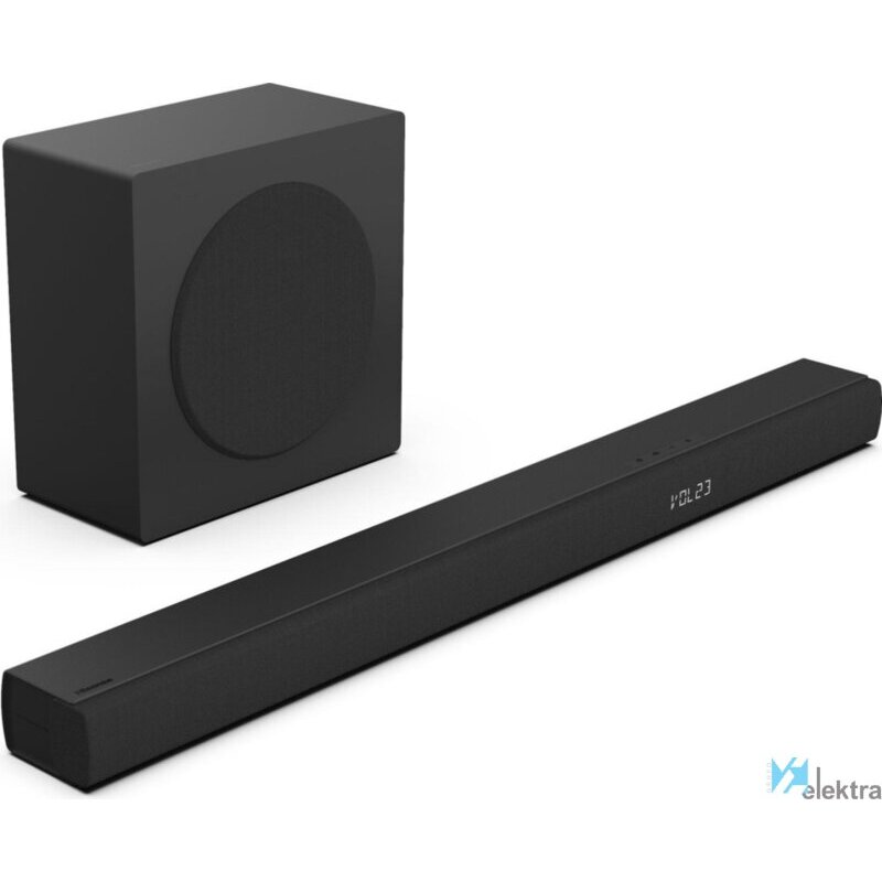 Hisense HS3100. Canales de salida de audio: 3.1 canales, Potencia estimada RMS: 480 W, Decodificadores incorporados: DTS Virtual:X, Dolby Digital. Potencia de la barra de sonido del altavoz RMS: 180 W. Tipo de subwoofer: Altavoz de subgraves (subwoofer) activo, Conectividad del altavoz de subgraves (subwoofer): Inalámbrico, Potencia RMS de subwoofer: 180 W. Color del producto: Negro. Tecnología de conectividad: Inalámbrico y alámbrico