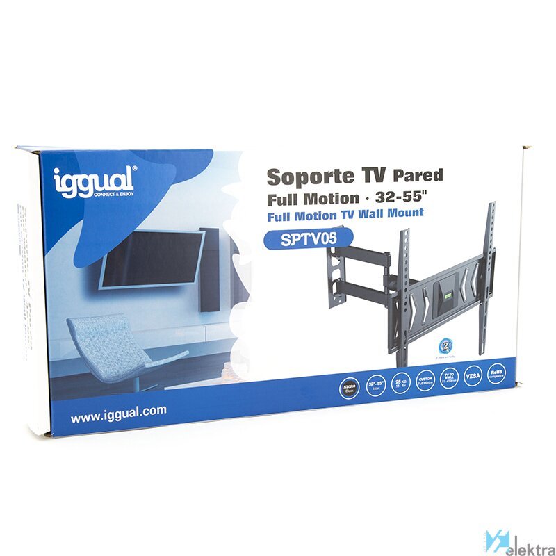iggual SPTV05. Capacidad máxima de peso: 25 kg, Tamaño mínimo de pantalla: 81,3 cm (32"), Tamaño máximo de pantalla: 139,7 cm (55"), Compatibilidad con interfaz de montaje (max): 400 x 400 mm. Ángulo de inclinación: 5 - 15°, Distancia a la pared (min): 7,1 cm, Distancia a la pared (max): 45,9 cm. Color del producto: NegroRecipiente :