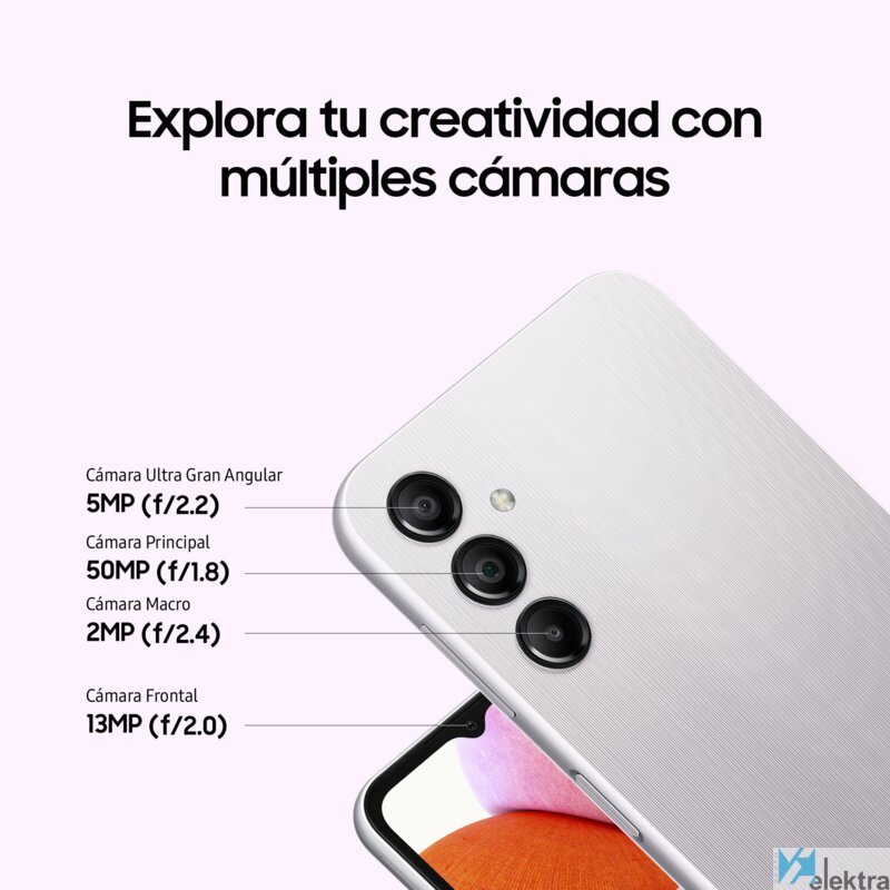 Samsung Galaxy A14 . Diagonal de la pantalla: 16,8 cm (6.6"), Resolución de la pantalla: 1080 x 2408 Pixeles. Frecuencia del procesador: 1,8 GHz. Capacidad de RAM: 4 GB, Capacidad de almacenamiento interno: 64 GB. Resolución de la cámara trasera (numérica): 50 MP, Tipo de cámara trasera: Triple cámara. Capacidad de la tarjeta SIM: SIM doble. Capacidad de batería: 5000 mAh. Color del producto: ...Recipiente :