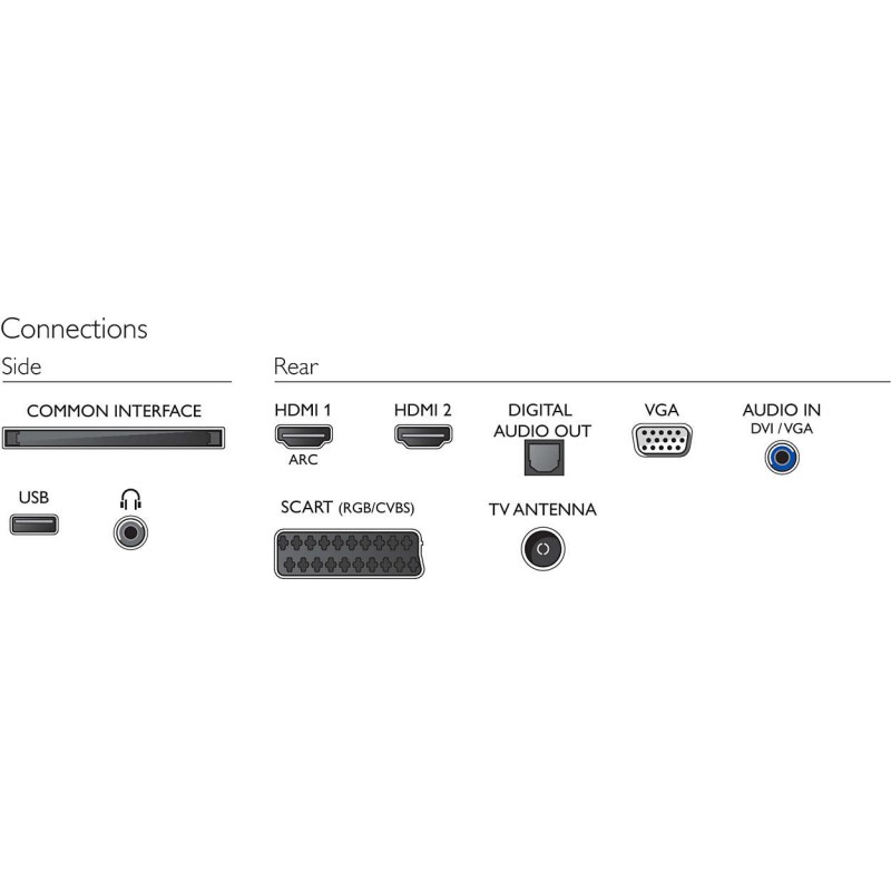 •Otras conexiones: Antena IEC75, Common Interface Plus (CI+), Salida de audio digital (óptica), Entrada de audio (DVI), Salida de auriculares