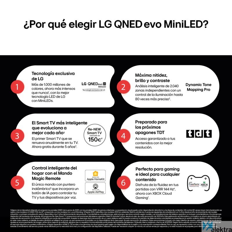 | Prestaciones Smart TV | Full IA; webOS 25 IA con Copilot; Función Asistente Chatbot; Google Assistant; Alexa Integrado; Apple Home; LG ThinQ; Control por voz; TV Siempre Lista; Magic Remote MR25GA; Funciona con Apple Airplay; GoogleCast; Multipantalla (2 Ventanas) |