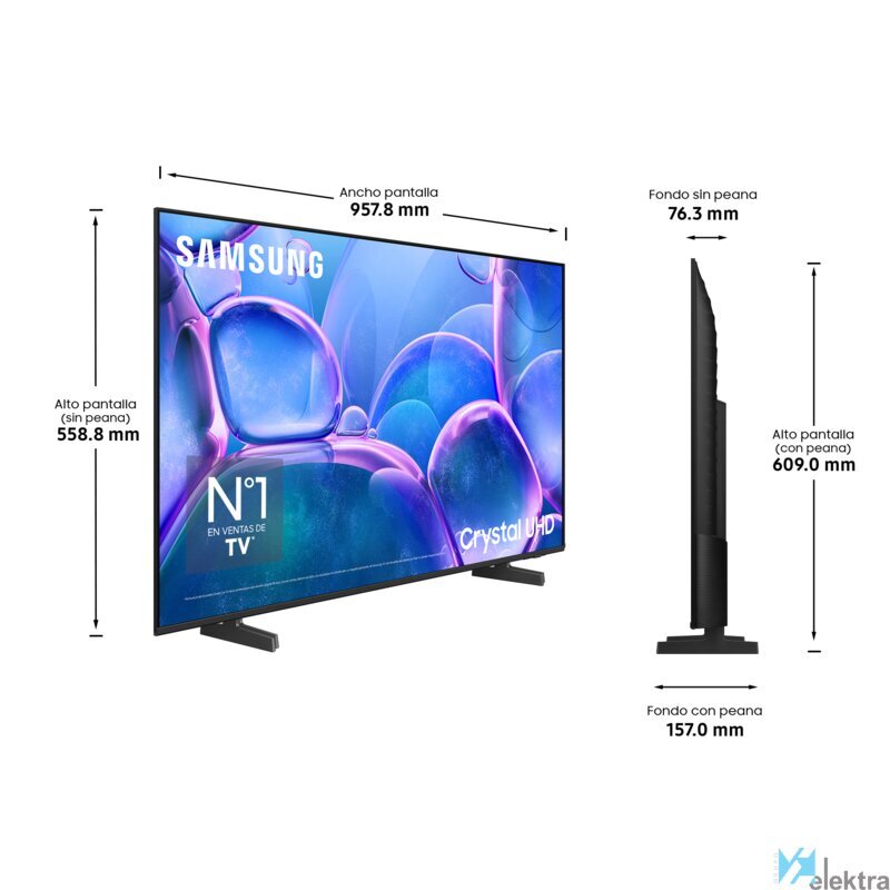 Samsung TU43U7025FK. Diagonal de la pantalla: 109,2 cm (43"), Resolución de la pantalla: 3840 x 2160 Pixeles, Tipo HD: 4K Ultra HD, Tecnología de visualización: LED, Forma de la pantalla: Plana. Smart TV. Tecnología de interpolación de movimiento: Motion Xcelerator, Relación de aspecto nativa: 16:9. Formato de señal digital: DVB-C, DVB-T2. Wifi, Ethernet. Color del producto: Negro