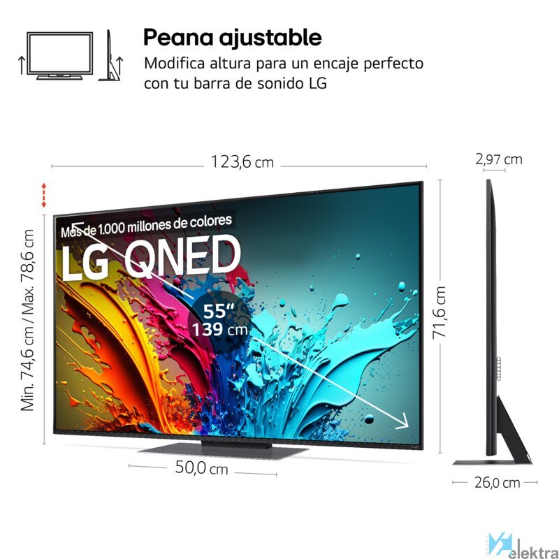 | Características pantalla | QNED 4K, SmartTV webOS 24, Procesador Inteligente 4K a8, Local Dimming; HDR10 / HLG, Filmmaker Mode?, >90% reproducción Color DCI-P3, LED Perimetral 6 Bloques; 55"; 139 cm; 120 Hz. |