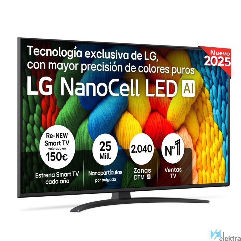 LG NanoCell AI 50NANO81A6A. Diagonal de la pantalla: 127 cm (50"), Resolución de la pantalla: 3840 x 2160 Pixeles, Tipo HD: 4K Ultra HD, Tecnología de visualización: NanoCell, Forma de la pantalla: Plana, Tipo de retroiluminación LED: Direct-LED. Smart TV. Relación de aspecto nativa: 16:9. Formato de señal digital: DVB-S, DVB-S2, DVB-T, DVB-T2. Wifi, Ethernet. Color del producto: NegroRecipiente :