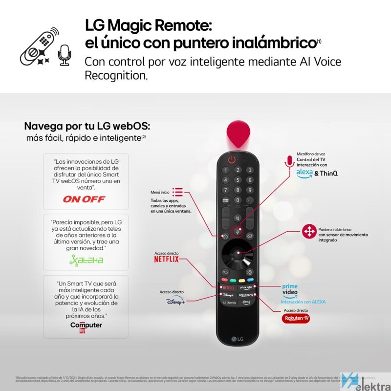 | Prestaciones Smart TV | Full IA; SmartTV webOS 24; Asistente Chatbot; Google Assistant; Alexa; Apple HomeKit; ThinQ; Control por voz con M. R.; Magic Remote MR24 incluido; Apple Airplay2; Chromecast Integrado; Navegador Libre. |