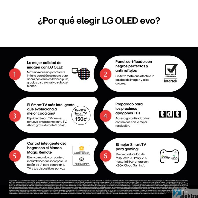 | Prestaciones Smart TV | Full IA; webOS 25 IA con Copilot; Chatbot; Google Assistant; Alexa; Apple Home; LG ThinQ; Control por voz sin mando; TV Siempre Lista; Magic Remote MR25GA; Apple Airplay; GoogleCast; Multipantalla (4 Ventanas); Navegador Libre. |