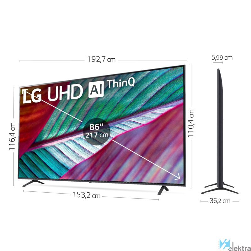 LG UHD 86UR78006LB. Diagonal de la pantalla: 2,18 m (86"), Resolución de la pantalla: 3840 x 2160 Pixeles, Tipo HD: 4K Ultra HD, Tecnología de visualización: LED, Forma de la pantalla: Plana, Tipo de retroiluminación LED: Direct-LED. Smart TV. Relación de aspecto nativa: 16:9. Formato de señal digital: DVB-S, DVB-T, DVB-T2. Wifi, Ethernet. Color del producto: NegroRecipiente :