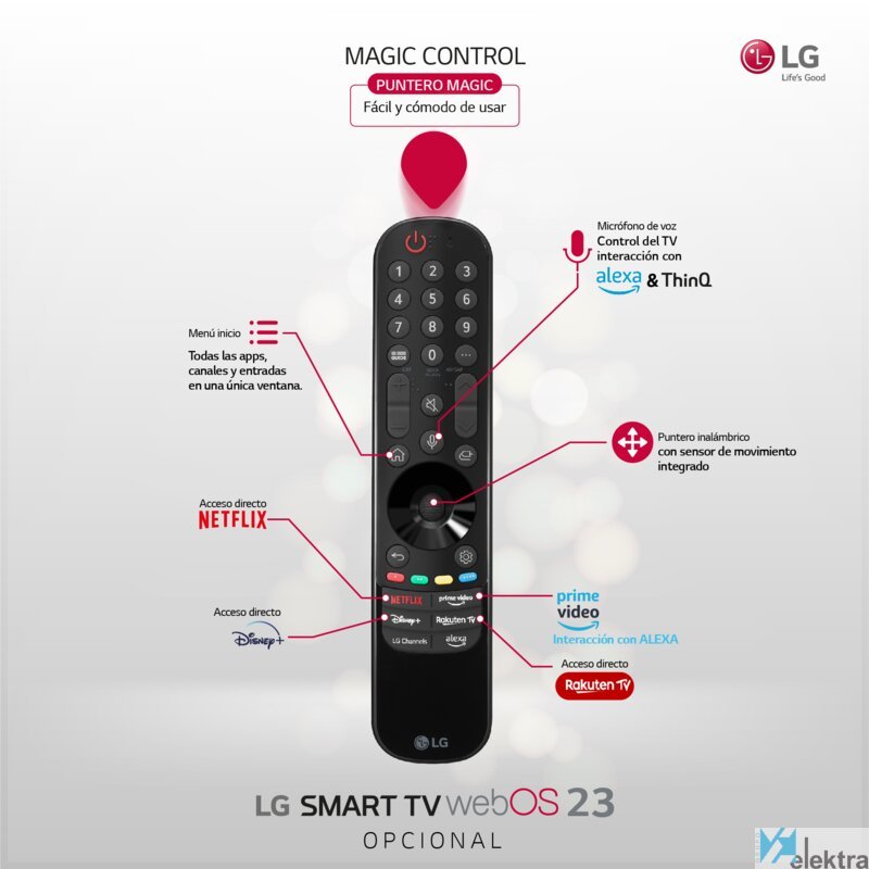 | Otras características | Conectividad Inteligente ThinQ AI: Controla con la voz Todos los dispositivos inteligentes del hogar. Compatible con Google Assistant, Alexa y Apple Home Kit. Procesador Inteligente 4K a5 Gen 6 Realiza Escalados 4K con gran precisión aplicando Dynamic Tone Mapping que Actúa sobre 576 áreas de cada fotograma. Smart TV webOS23 con perfiles de usuario independientes para personalizar tus apps y recomendaciones. Más fácil, intuitivo y seguro. |