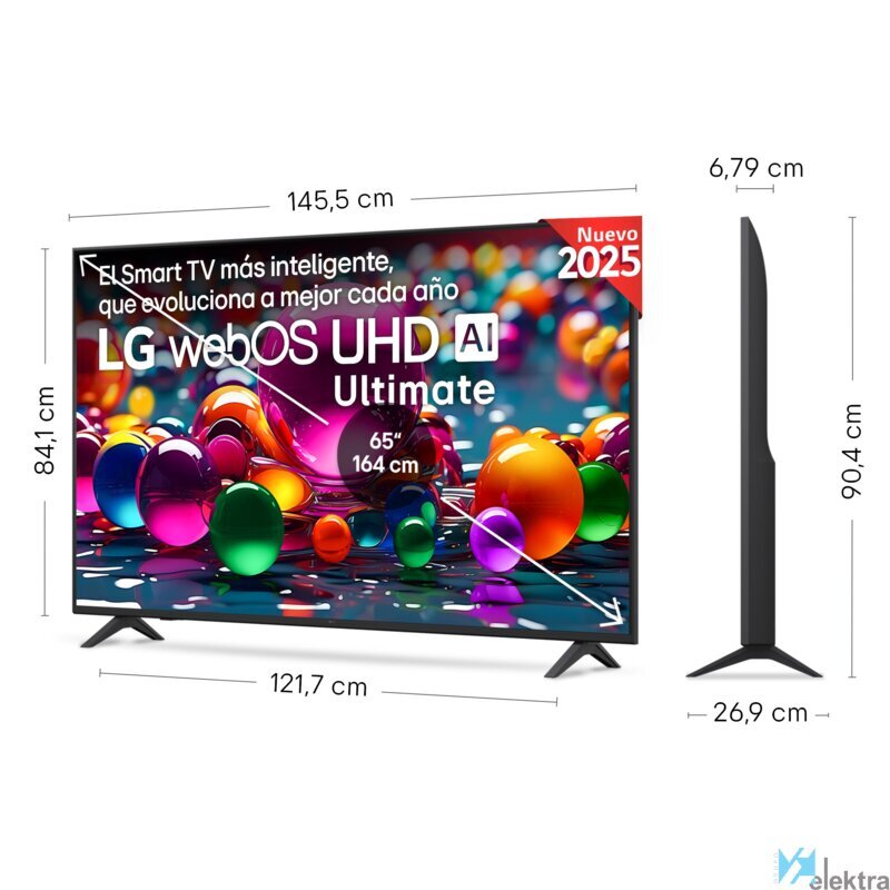LG UHD AI 65UA75006LA. Diagonal de la pantalla: 165,1 cm (65"), Resolución de la pantalla: 3840 x 2160 Pixeles, Tipo HD: 4K Ultra HD, Tecnología de visualización: LED, Forma de la pantalla: Plana, Tipo de retroiluminación LED: Direct-LED. Smart TV. Relación de aspecto nativa: 16:9. Formato de señal digital: DVB-S, DVB-S2, DVB-T, DVB-T2. Wifi, Ethernet. Color del producto: NegroRecipiente :