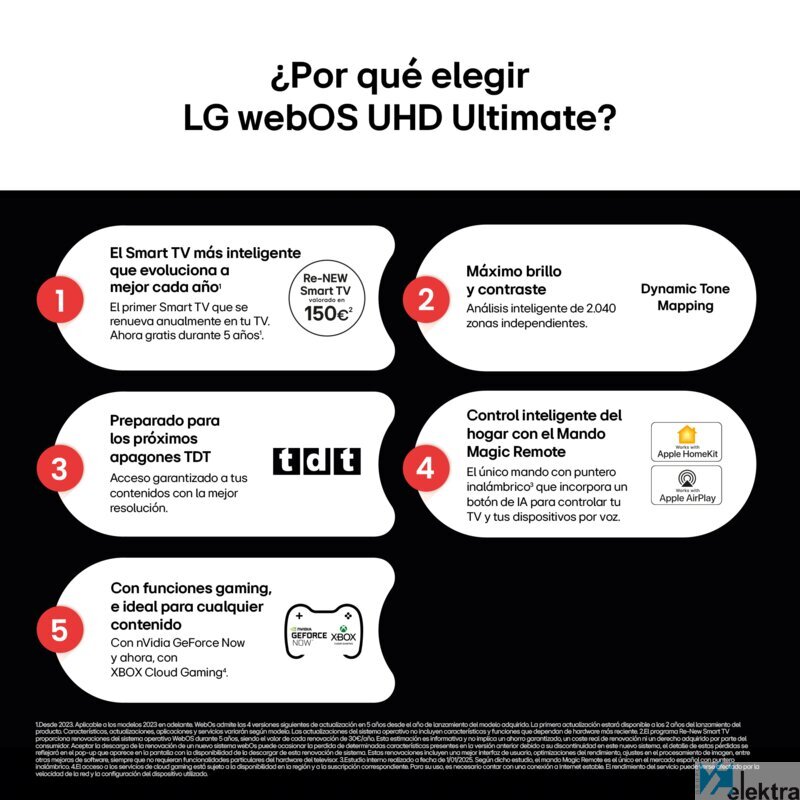 | Descripcion SmartTV | Smart TV webOS 25 que evoluciona a mejor cada año renovándose en tu TV e incorporando las nuevas funciones de la IA y que está preparado para próximos apagones TDT. |