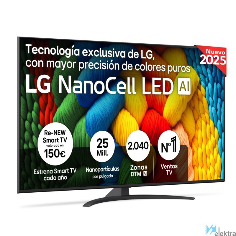 LG NanoCell AI 65NANO81A6A. Diagonal de la pantalla: 165,1 cm (65"), Resolución de la pantalla: 3840 x 2160 Pixeles, Tipo HD: 4K Ultra HD, Tecnología de visualización: NanoCell, Forma de la pantalla: Plana, Tipo de retroiluminación LED: Direct-LED. Smart TV. Relación de aspecto nativa: 16:9. Formato de señal digital: DVB-S, DVB-S2, DVB-T, DVB-T2. Wifi, Ethernet. Color del producto: NegroRecipiente :