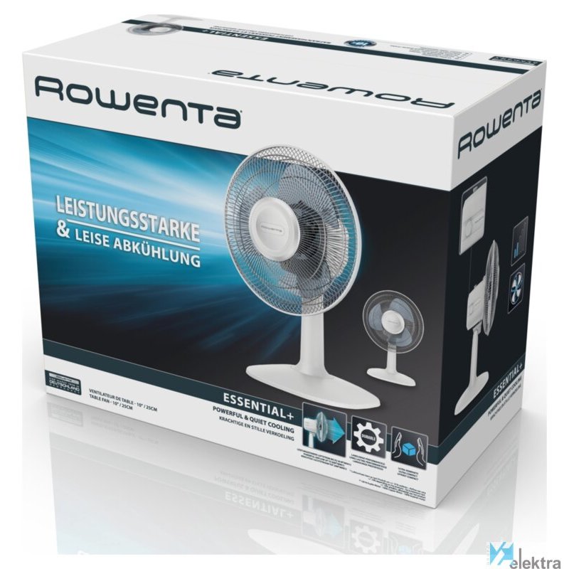 | Información suplementaria | Con el potente ventilador de mesa Essential + de Rowenta, refresca tu casa de forma silenciosa. Gracias a su gran rendimiento, su increíble nivel de silencio, sus dos velocidades y una amplia variedad de prácticas prestaciones, este ventilador es un accesorio esencial para tu hogar durante los meses más calurosos. |